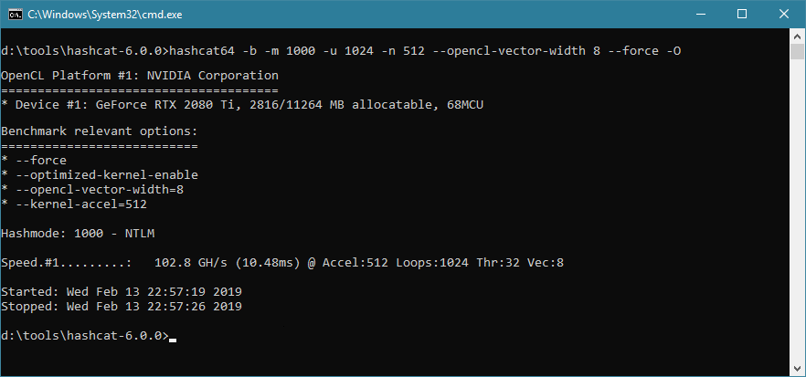 En una publicación de Twitter el miércoles, quienes están detrás del proyecto de software dijeron que una versión optimizada a mano de la versión 6.0.0 HashCat beta, que utiliza ocho GPU Nvidia GTX 2080Ti en un ataque fuera de línea, superó el punto de referencia de velocidad de craqueo NTLM de 100GH/s (Gigahashes por segundo).